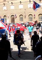 Die Zugehörigkeit zur eigenen Contrada wird durch ein um den Hals getragenes Tuch mit den Farben und dem Symboltier des Stadtteils demonstriert. Das gefällt mir auf Anhieb so gut, dass ich so ein Tuch sofort haben möchte.